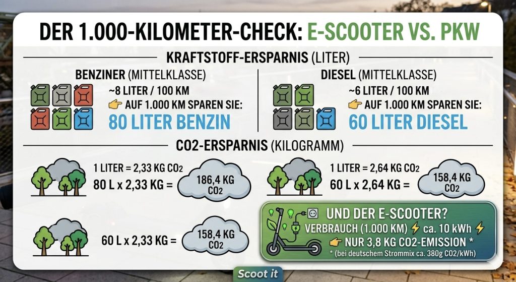 Die ökologische Ersparnis geht Hand in Hand mit einer ökonomischen Entlastung. 1.000 Kilometer auf dem Scooter bedeuten, dass bis zu 80 Liter Benzin oder 60 Liter Diesel weniger verbraucht wurden. Bei den aktuellen Kraftstoffpreisen entspricht das einer Ersparnis von rund 160 € bis 180 €.