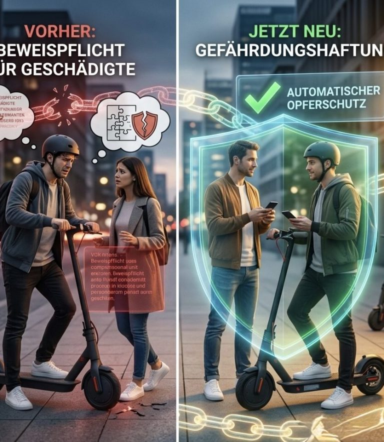 E-Scooter werden jetzt rechtlich dem Auto gleichgestellt. Das bedeutet Haftung durch Betrieb: Allein dadurch, dass man einen Scooter im Verkehr bewegt, entsteht eine sogenannte „Betriebsgefahr“ – wie beim Auto.